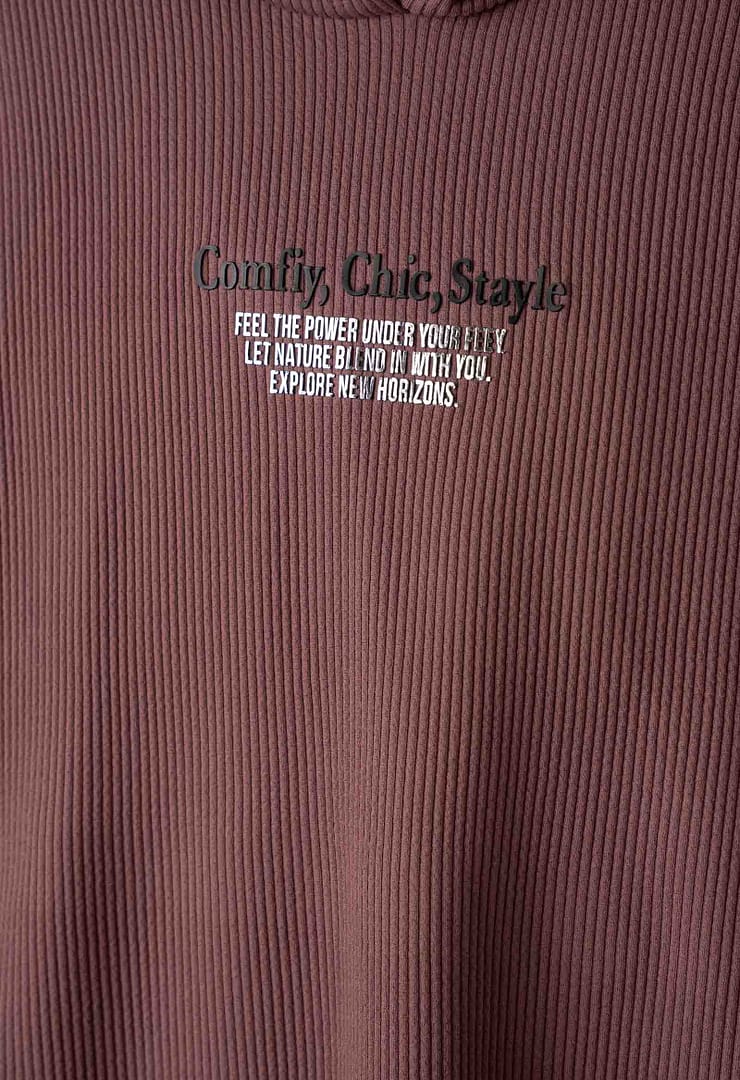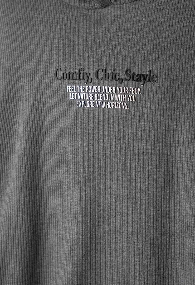 Μπλούζα μακρυμάνικη, με κουκούλα και τύπωμα “COMFIY, CHIC, STAYLE”. Φόρμα καμπάνα, με λάστιχο στην μέση, μονόχρωμη.