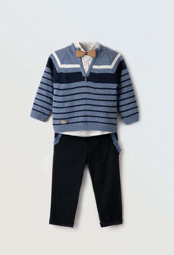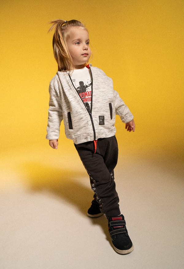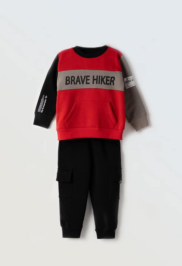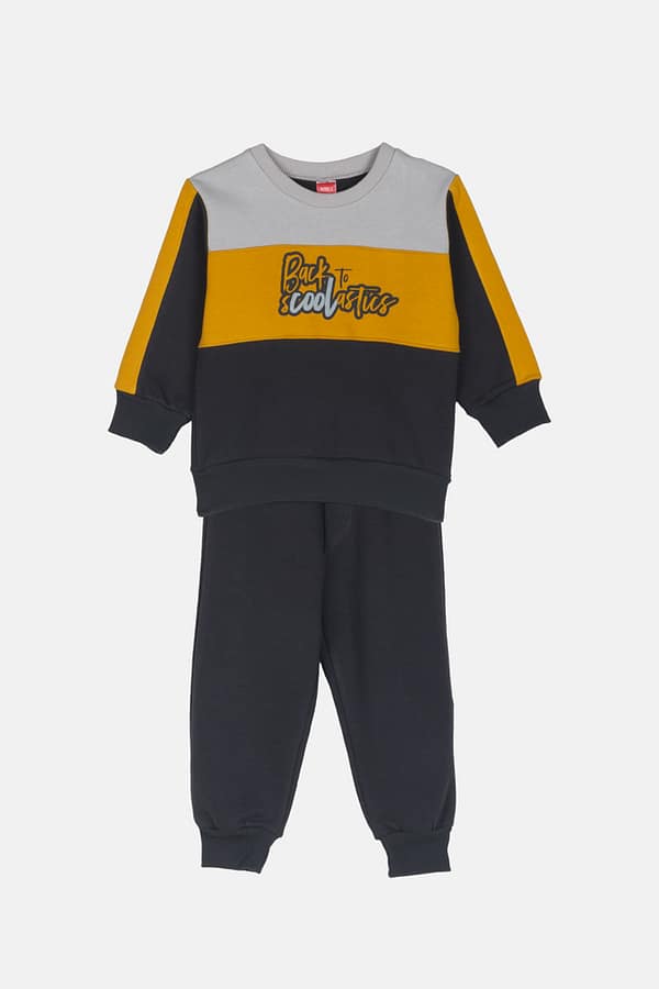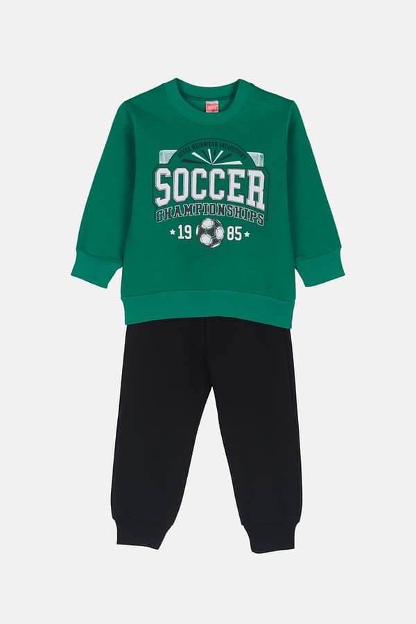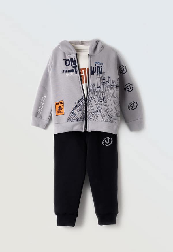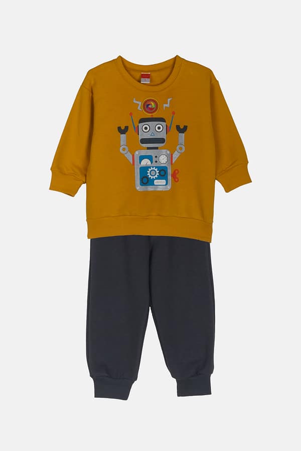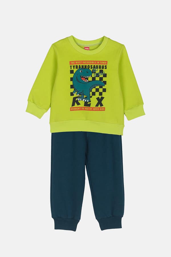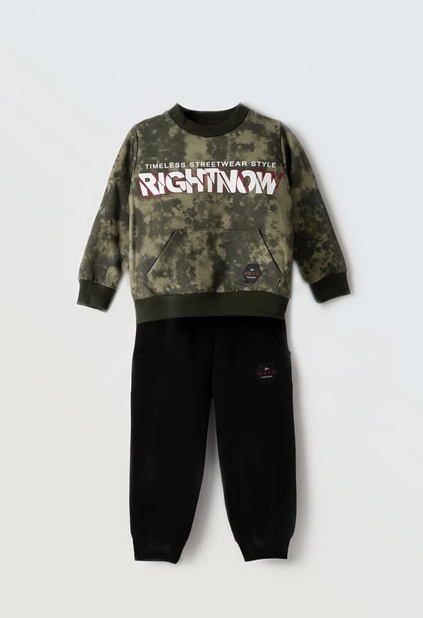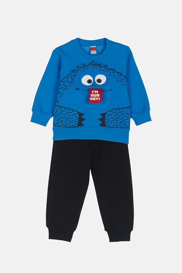 Mπλούζα με στρογγυλό γιακά και τύπωμα “PLANET”. Παντελόνι φόρμα με λάστιχο στο πάνω και το κάτω μέρος, μονόχρωμο.