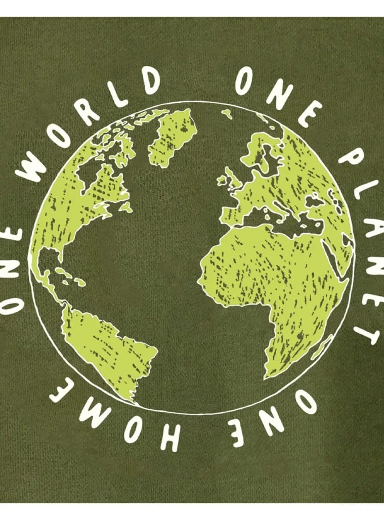 Mπλούζα με στρογγυλό γιακά και τύπωμα “PLANET”. Παντελόνι φόρμα με λάστιχο στο πάνω και το κάτω μέρος, μονόχρωμο.