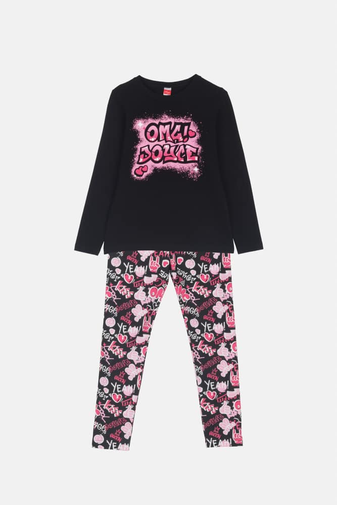 Μπλούζα με στρογγυλό γιακά και τύπωμα “OMG!”. Κολάν με λάστιχο στη μέση και εμπριμέ τύπωμα.